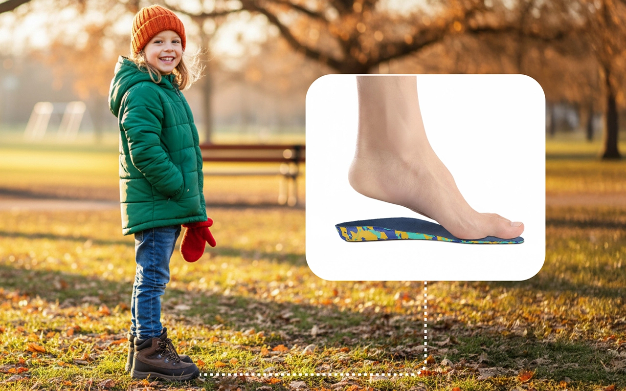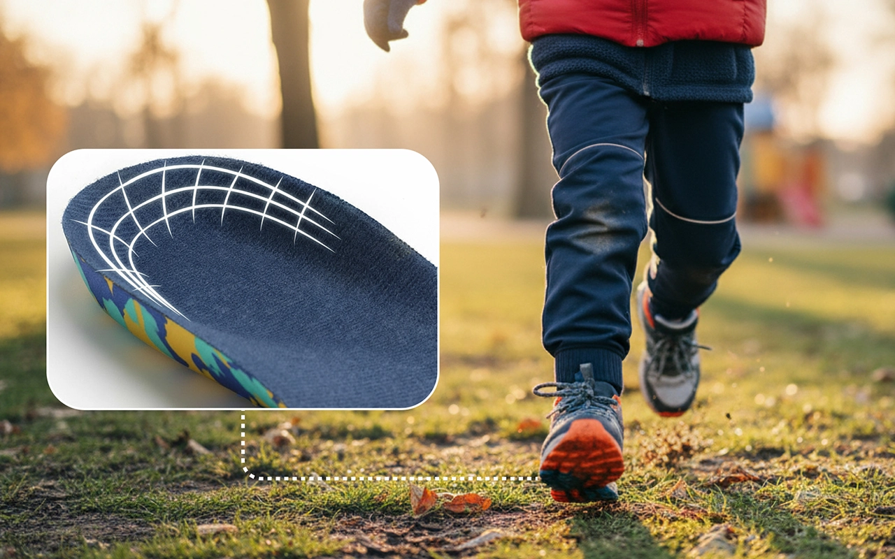 Smerter kan hindre barn fra å leke og drive med sport. Spesialpolstring bidrar til å redusere belastning fra å stå eller bevege seg hele dagen.
