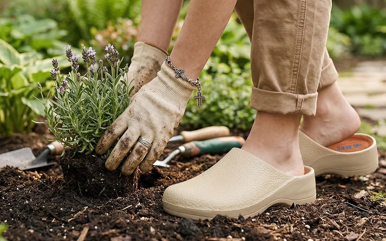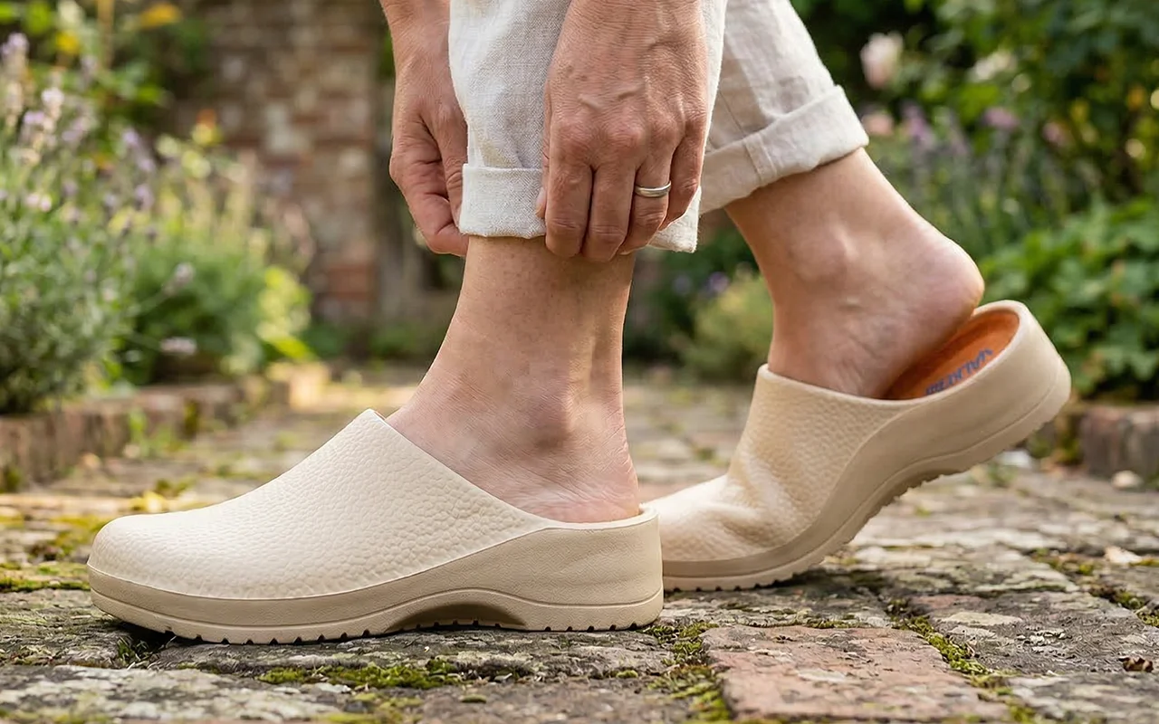 Støttende design avlaster slitne fotbuer. Mykt fôr reduserer ømhet slik at du kan stå lenger i hagen eller på jobb.