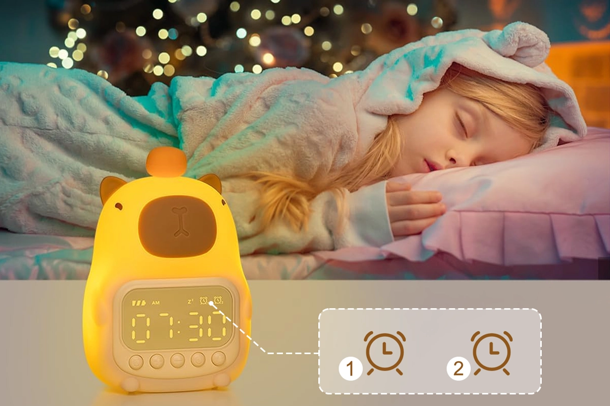 Doble alarmer lar barna styre skoledager eller helger. Slumrefunksjon gir en myk oppvåkning slik at morgener føles bedre.