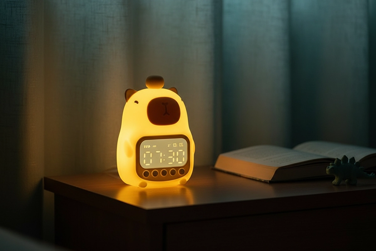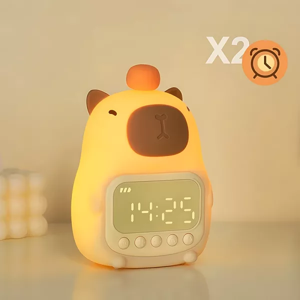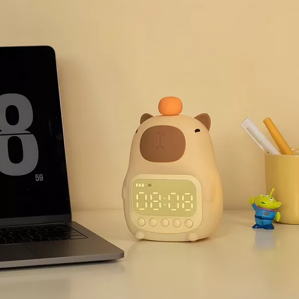 Kjøpte denne kapybara-klokken til sønnens rom. Det myke lyset gjør leggetiden rolig, og de enkle knappene hjalp ham å lære å stille sin egen alarm.