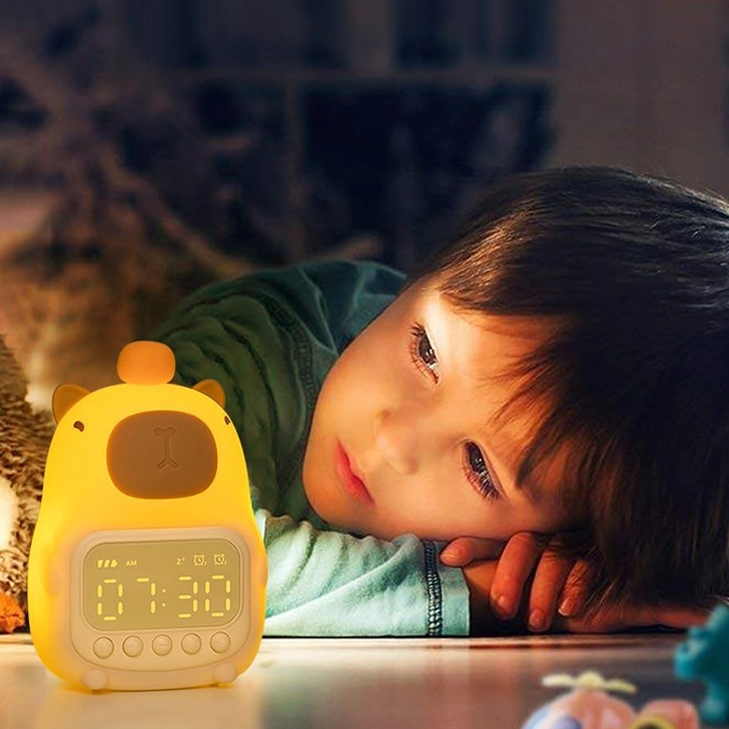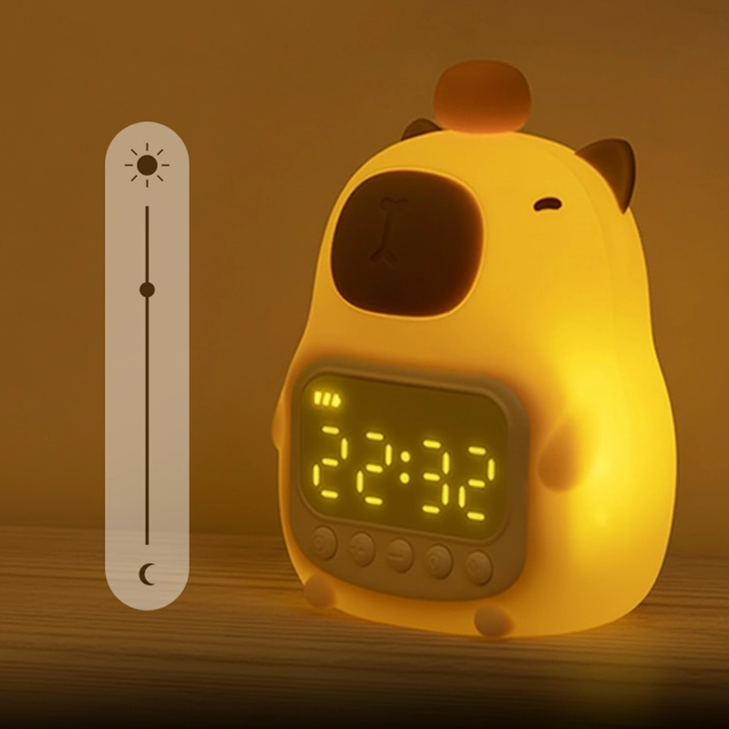 Kjøpte denne kapybara-klokken til sønnens rom. Det myke lyset gjør leggetiden rolig, og de enkle knappene hjalp ham å lære å stille sin egen alarm.
