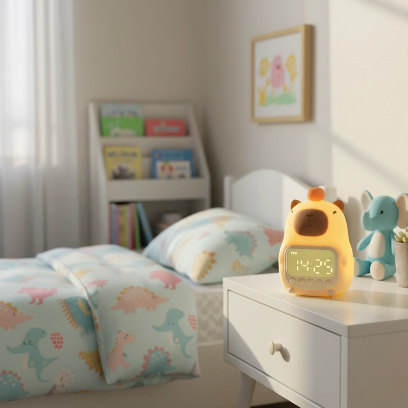 Skånsomt lys hjelper barn å føle seg trygge etter leggetid. Enkle digitale kontroller gjør det lett å våkne hver dag. Trygge, myke materialer føles behagelige og beroligende om natten. Ortorex Søt kapybara vekkerklokke gir glede til hvert soverom.