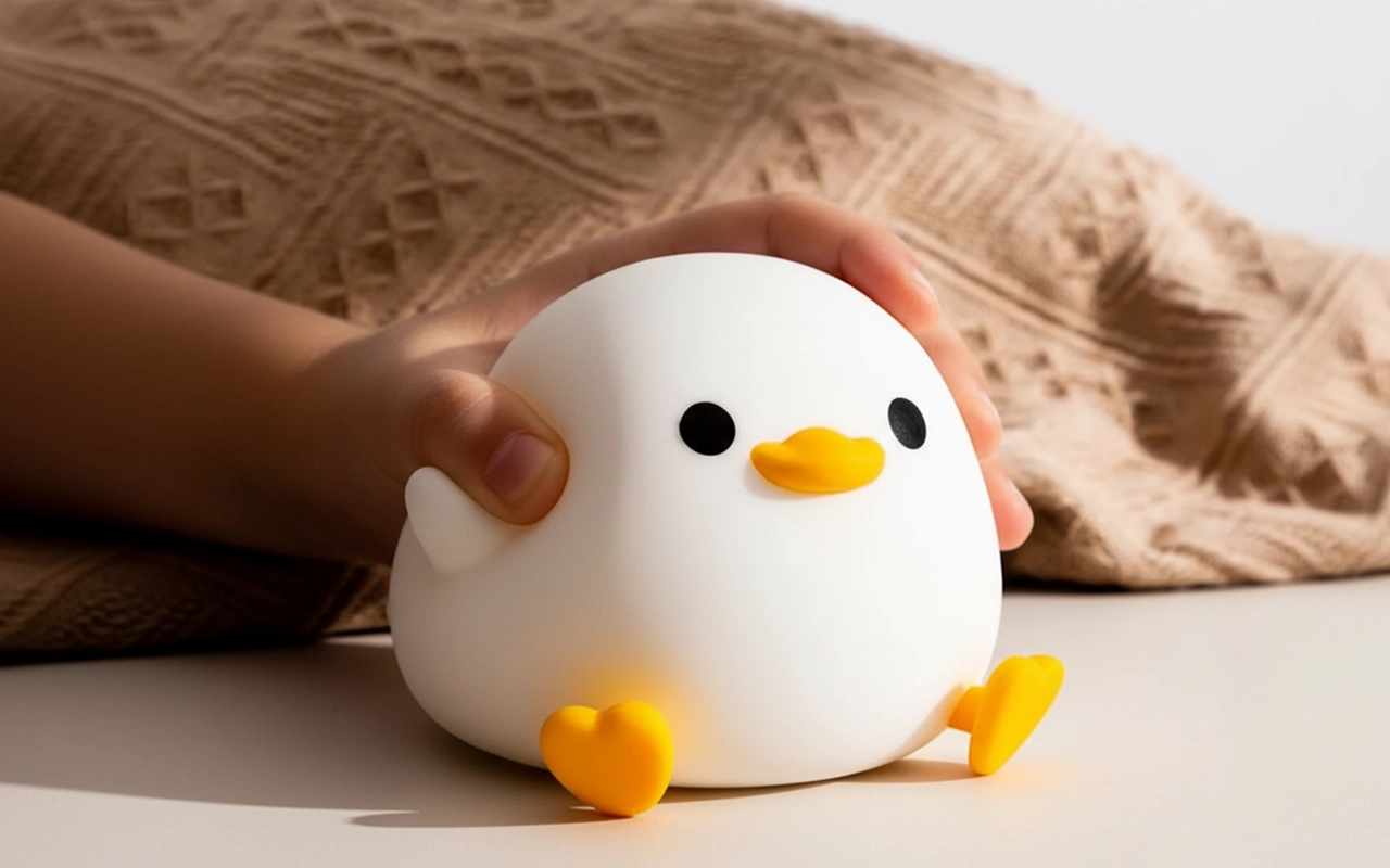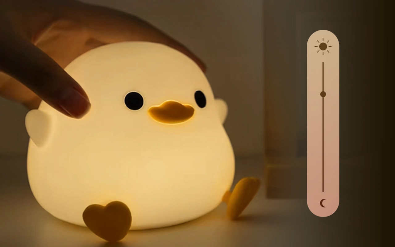 Datteren min var redd for mørket, men denne andelampen roer henne. Den myke silikonen føles god, og hun tapper på den for å dempe lyset ved leggetid.