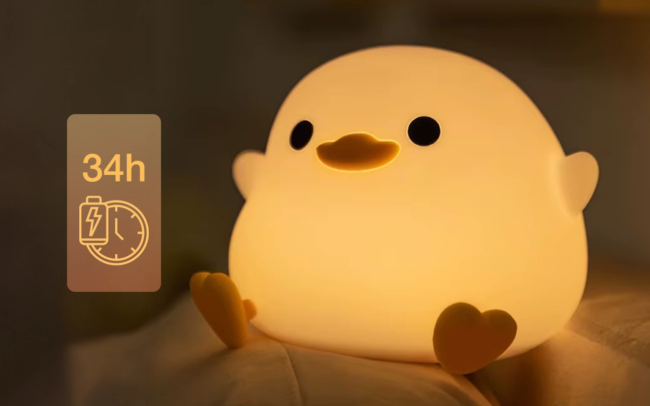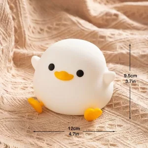 Jeg har denne anda på nattbordet når jeg ammer. Ett trykk gir nok lys uten å gjøre vondt i øynene. Silikonkroppen er lett å rengjøre etter nysgjerrige små hender.