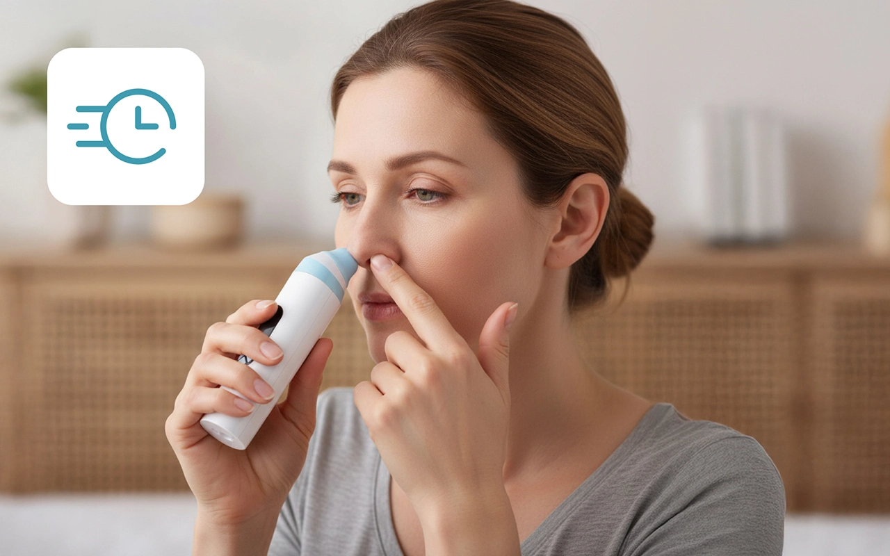 Ingen dråper eller propper trengs for effektiv lindring nå. Bare trykk, hold og kjenn umiddelbar lindring uten styr.