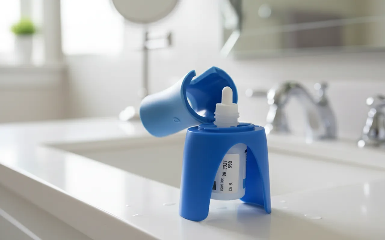 Denne dispenseren fungerer med nesten alle merker og størrelser av øyedråpeflasker.