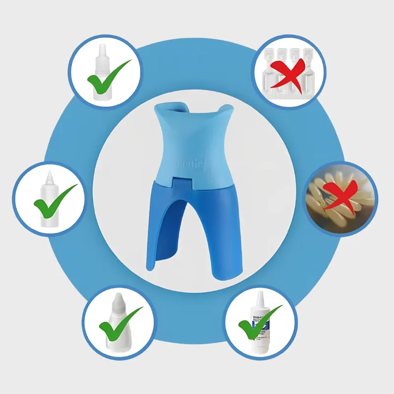 Fungerer med alle øyedråpeflaskene mine. Lett, så jeg har den i vesken. Ingen vonde merker etter bruk, noe jeg setter pris på.