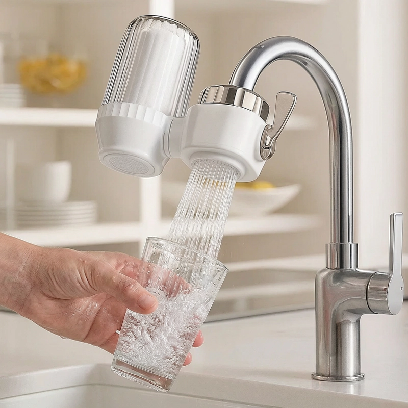 Dette lille kranfilteret sparer meg for penger hver måned. Det kan brukes om igjen, så jeg trenger ikke kjøpe nye patroner. Vannet ser alltid rent ut.