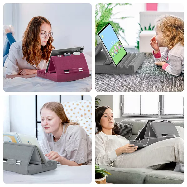 Denne puteholderen er så komfortabel og myk på beina mine. Jeg ser på filmer i sengen, og nettbrettet sklir aldri. Elsker den lille lommen til øretelefonene mine!