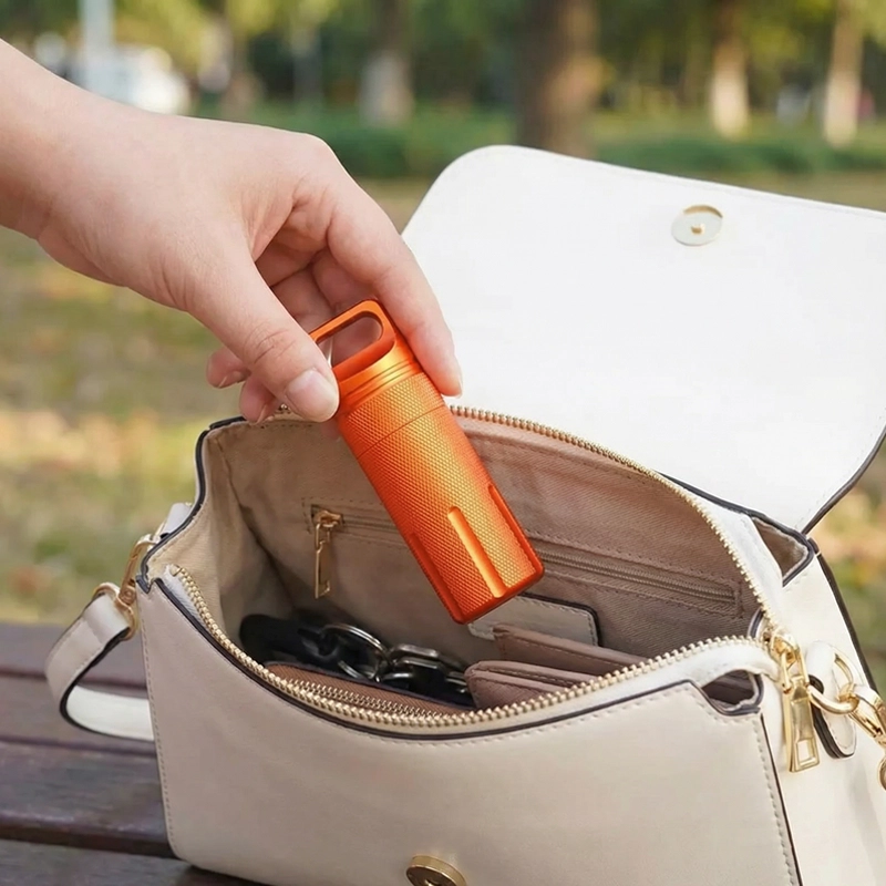 Vår pilleboks passer enkelt i håndflaten, vesken eller nøkkelringen uten å legge til vekt. Ha den med deg uansett hvor dagen tar deg.