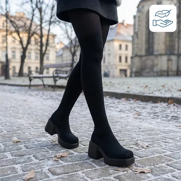 Ta på deg Ortorex-støvlene og kjenn umiddelbar komfort og støtte. Koselig strikket materiale omslutter bena dine forsiktig uten å gnage eller skli. Tykk såle gjør det lettere å gå og holder føttene trygge fra kalde gulv. Disse skoene gir høyde uten å gjøre balansen vanskelig.