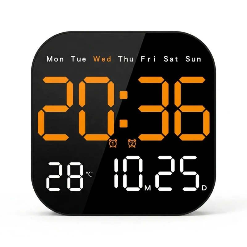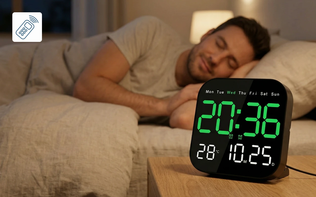 Ortorex veggklokke holder rutinene stabile i hvert rom. Én skjerm viser ukedag, kalender og innetemperatur. Endre innstillinger fra sengen ved hjelp av fjernkontrollen. Ti lysstyrkenivåer passer for hvilestunder, film og morgener.