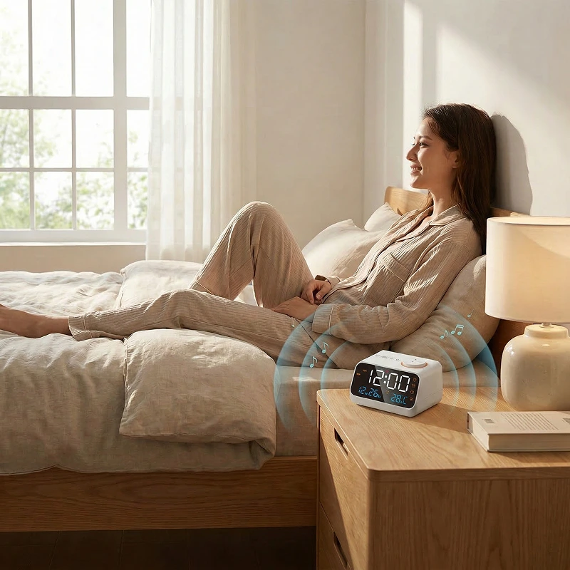 Still inn to separate alarmer for å holde rutinene enkle og pålitelige. Velg myk musikk eller livlig radio for å våkne rolig og klar.