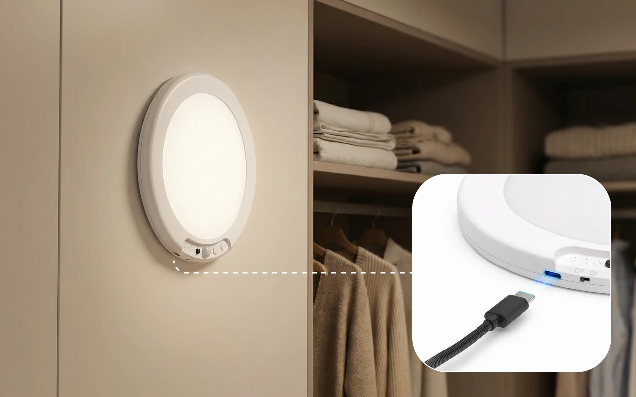 Ikke mer fomling etter en bryter! Den registrerer når jeg går inn og lyser opp med en gang. Å lade den med USB gikk også veldig raskt.