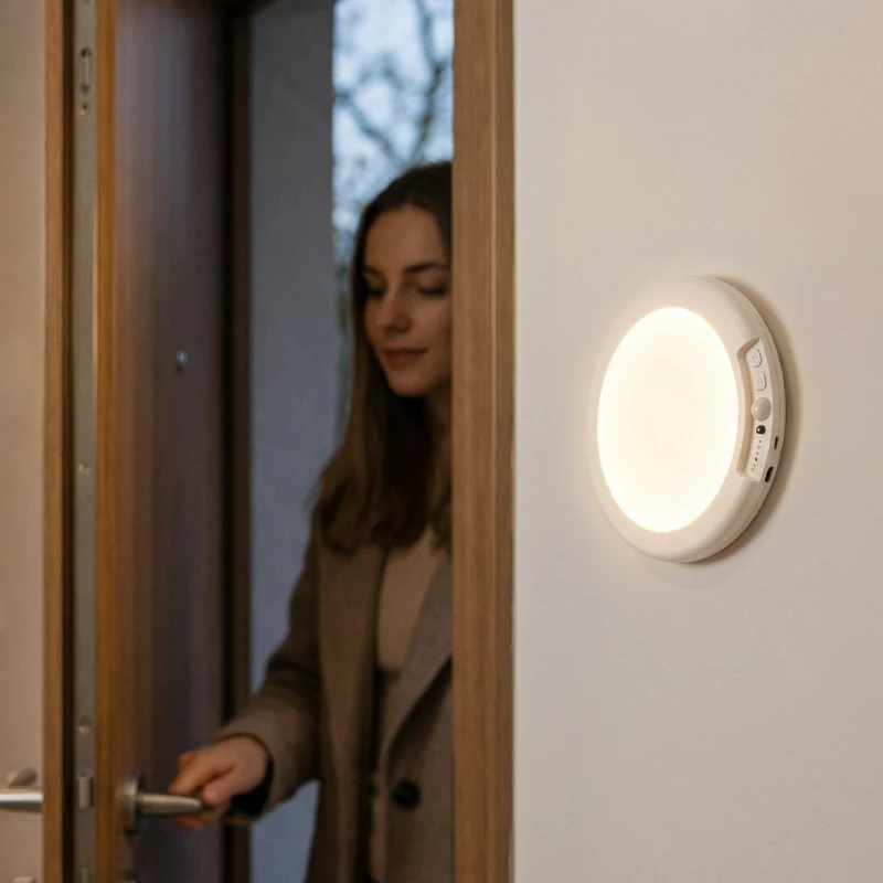 Jeg bruker fjernkontrollen hver kveld for å dimme lyset før leggetid. Bevegelsessensoren slår aldri feil når jeg kommer inn.