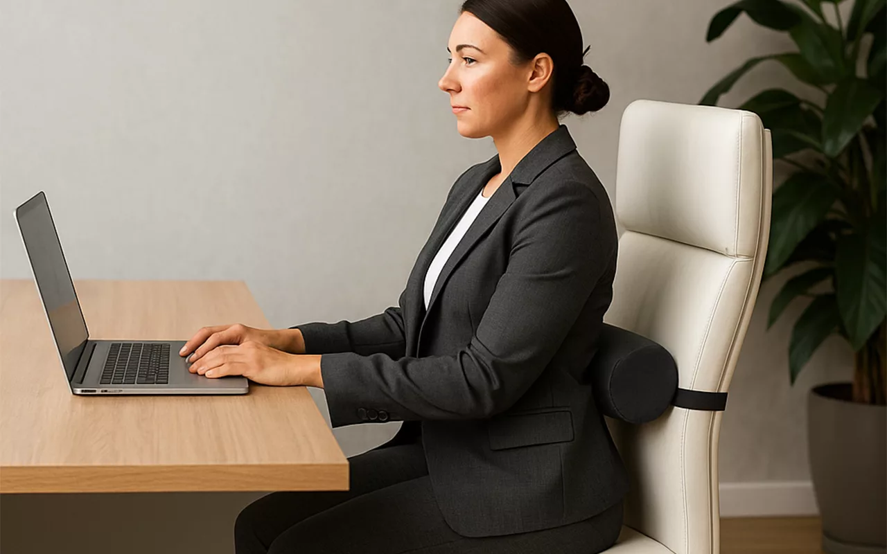 Fremmer en sunn ryggposisjon under lange arbeidsdager. Oppretthold riktig holdning og unngå å synke sammen eller bli sliten.