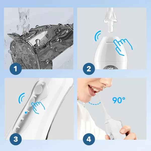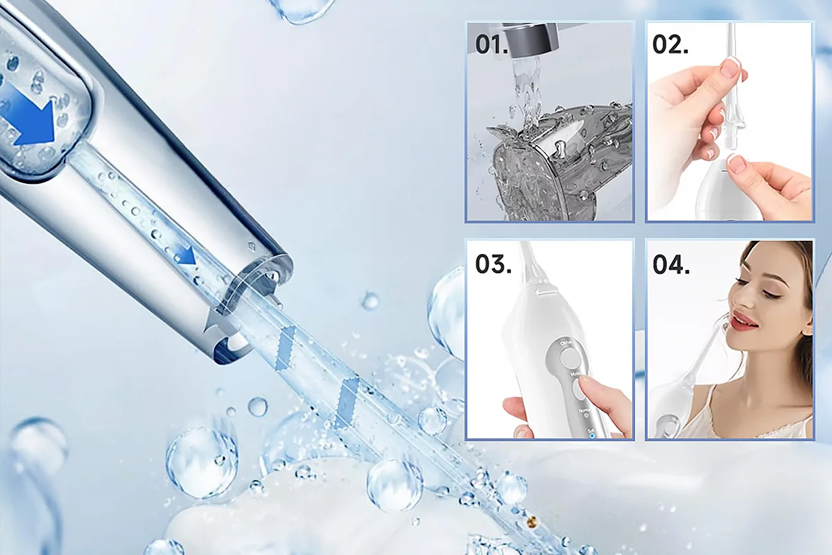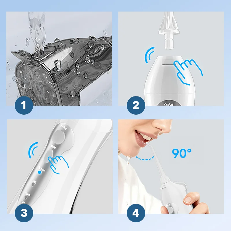 For å bruke Ortorex Irrigator, installer dysen, hell vann i tanken og velg modus.