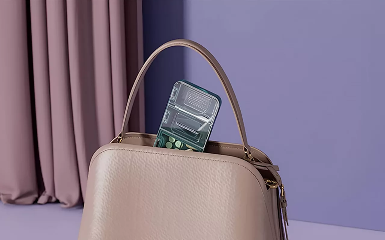 Fuktbestandig silikon holder innholdet tørt uansett hvor du er. Den lette kroppen lar deg trygt ta medisiner med deg overalt.