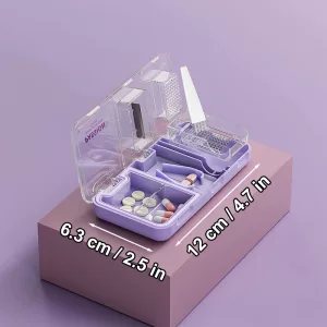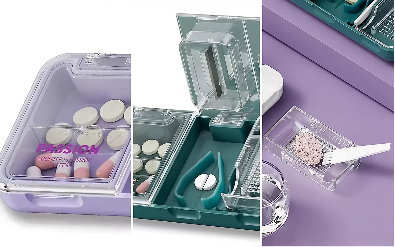 Tre nøkkelfunksjoner samlet i én enkel enhet. Oppbevar, del og knus tabletter uten søl eller rot.