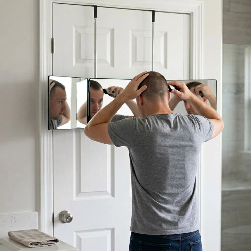 Det tresidede speilet lar meg trimme skjegget mye bedre enn før. Jeg kan endelig se baksiden av hodet uten å vri meg rundt.