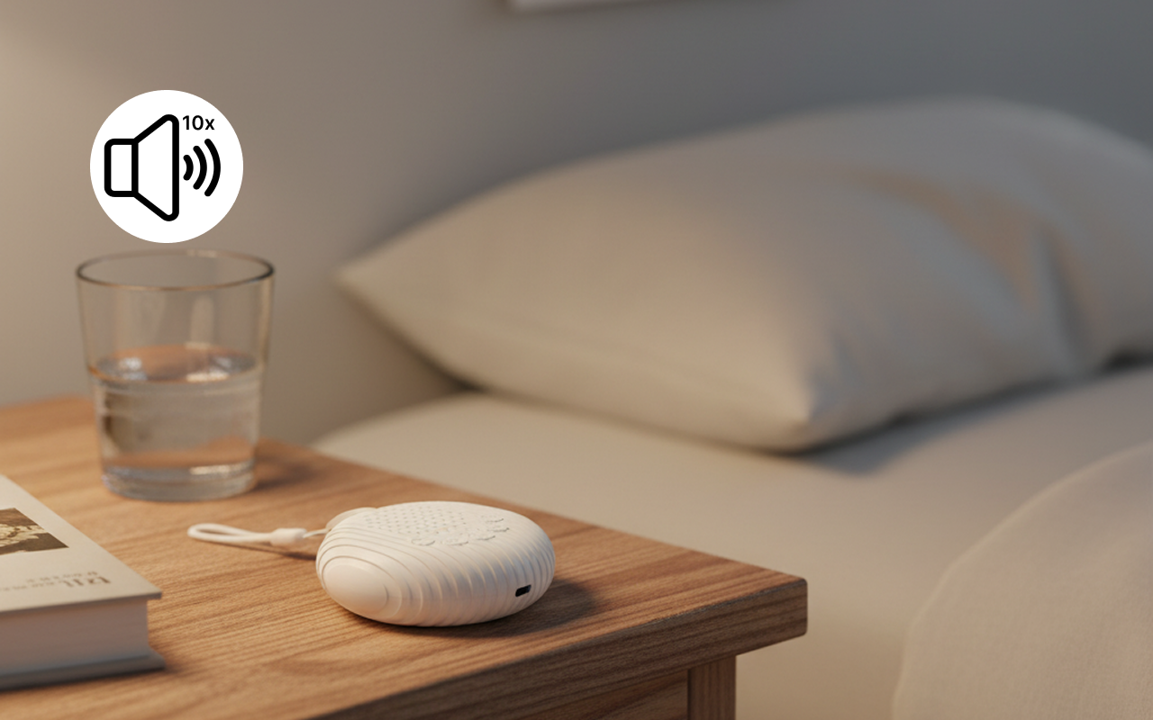 Visste ikke at bærbar hvitstøy var så nyttig. Tar den med på fly, i bil og bruker den til og med på hotellrom. Superpraktisk for dem som sover lett.