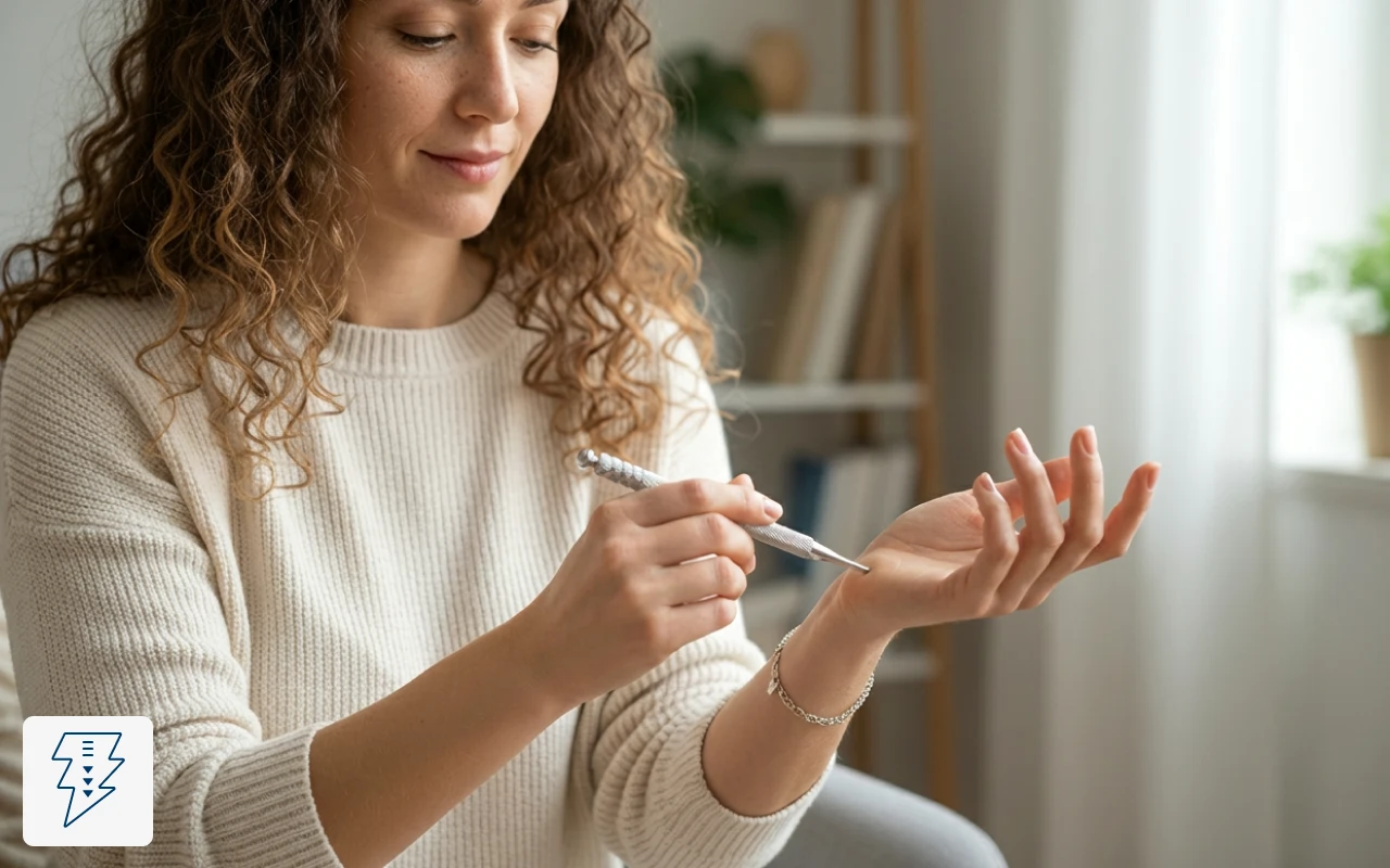 Etter lange vakter på beina kjører jeg pennen langs anklene og leggene. Den gir et mildt trykk som lindrer ømhet uten at man trenger batterier.