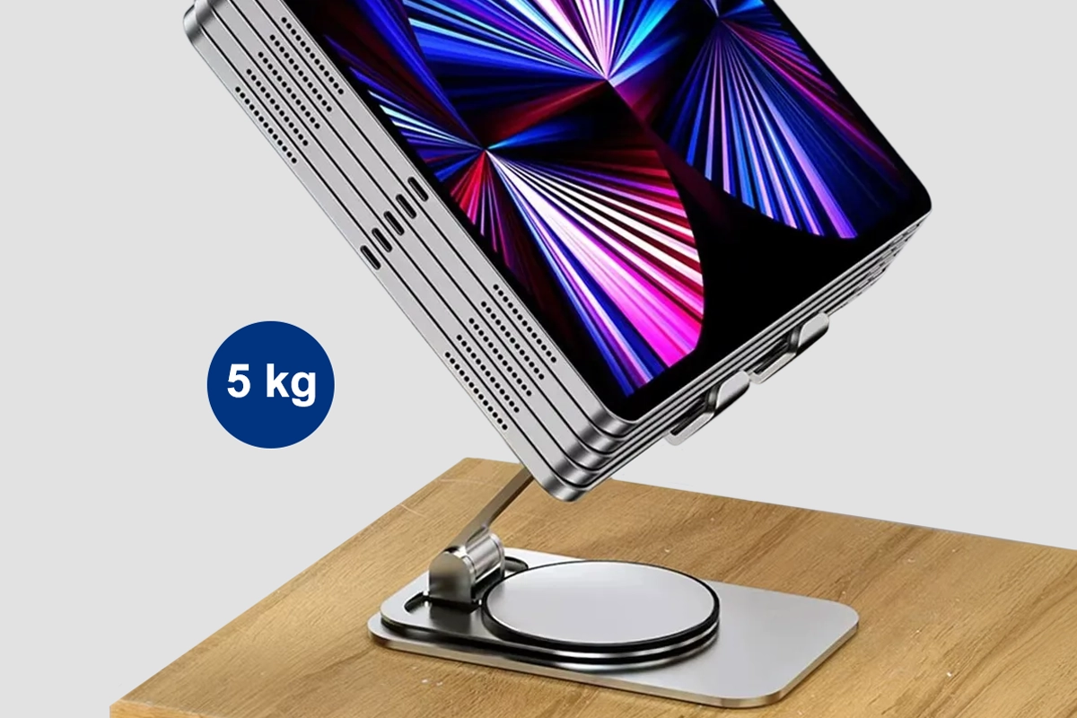 Metallbasen overrasket meg med hvor solid den føles. Nettbrettet mitt står støtt selv når jeg sveiper og trykker under nettkurs eller leser nyheter.