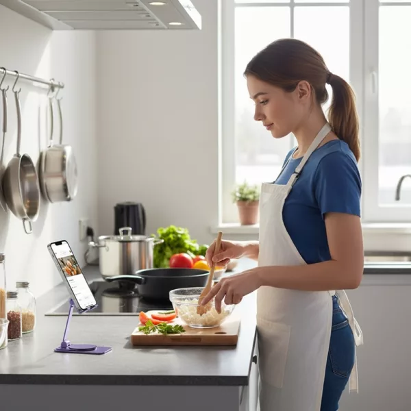 Jeg har dette stativet på kjøkkenbenken til oppskrifter og videosaler mens jeg lager. Det vippes jev og holder hele arbeids mitt ryddig.
