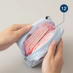 Jeg har alltid med meg den blå pungen min. Den får plass til bind, truseinnlegg og til og med en liten pakke med lommetørklær. Gjør skoledagene mine mye enklere.