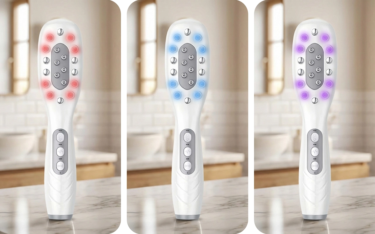 Rødt, blått og lilla lys retter seg mot ulike behov i hodebunnen. Disse modusene styrker røttene, reparerer hårsekkene og reduserer irritasjon raskt.