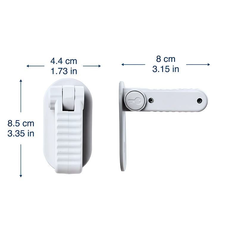 Denne låsen er utrolig nyttig! Supersterk lim, helt sikker, og kan fjernes uten noe søl. Gir meg mye trygghet med småen i huset.