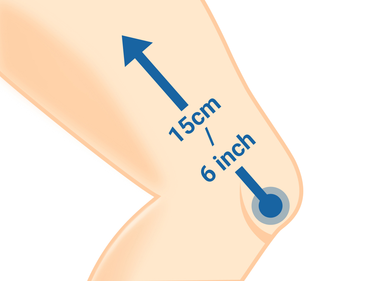 - 2. Start målebåndet 15 cm/6" over midtpunktet på kneskålen og før det ned til ankelen.
