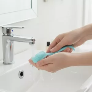 Ortorex hudskrubber passer komfortabelt selv i våte hender, noe som gjør den enkel å bruke.