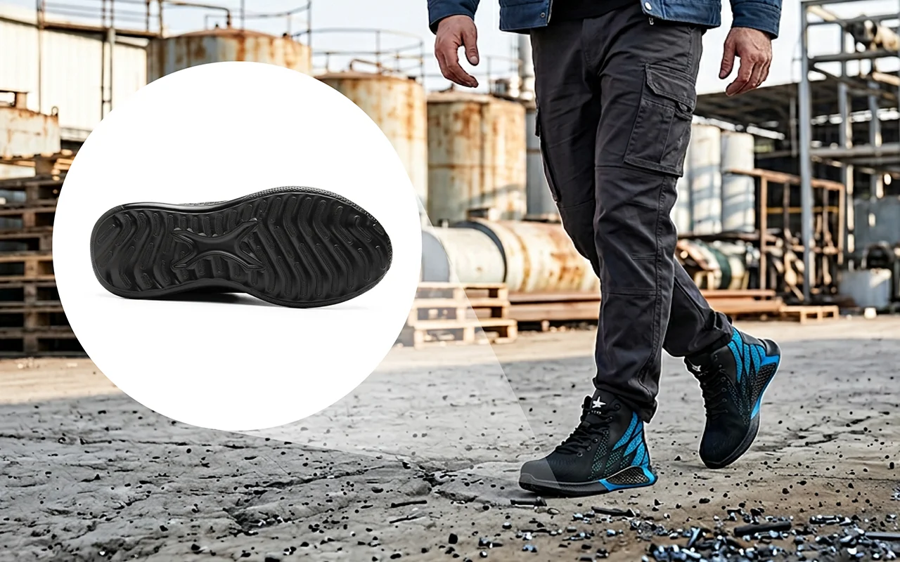 Ortorex-sneakers har mønstrede såler som gir godt grep på våte, oljete verkstedgulv. Stabilt fotfeste reduserer farlige glipp og gjør at arbeidere kan bevege seg raskere og mer selvsikkert.