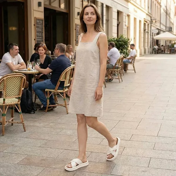 Kjøpte disse sandalene til ferie. Gikk langs strandpromenaden i timevis, og føttene mine var fortsatt avslappet. Den sklisikre sålen føltes stødig på glatte fliser.