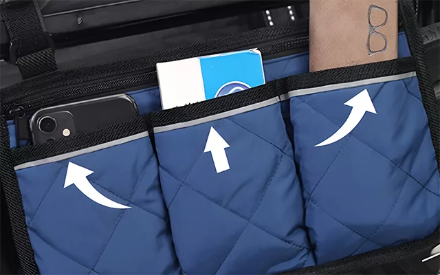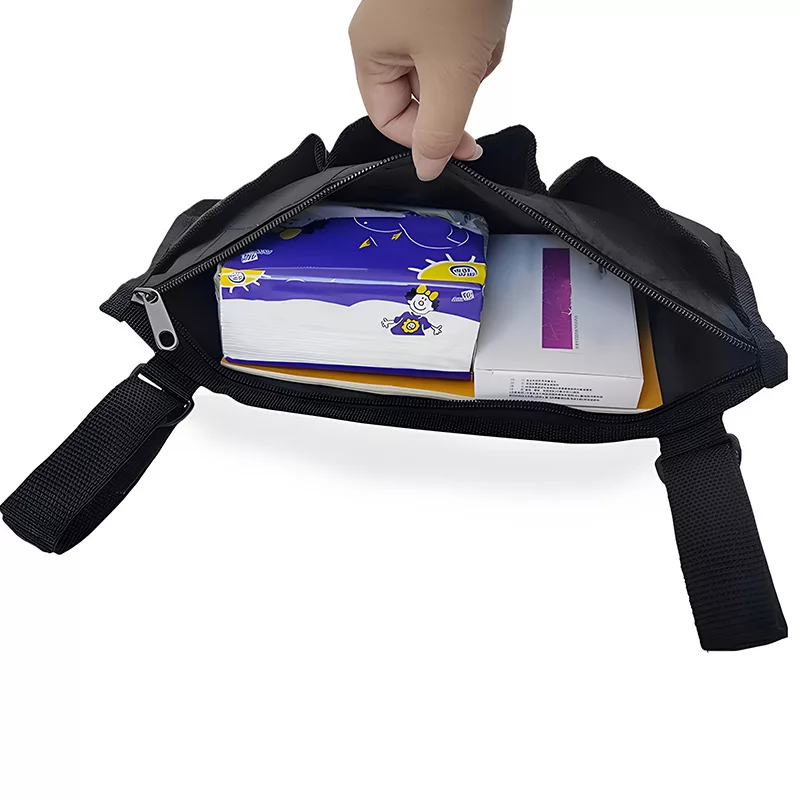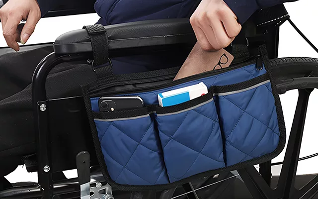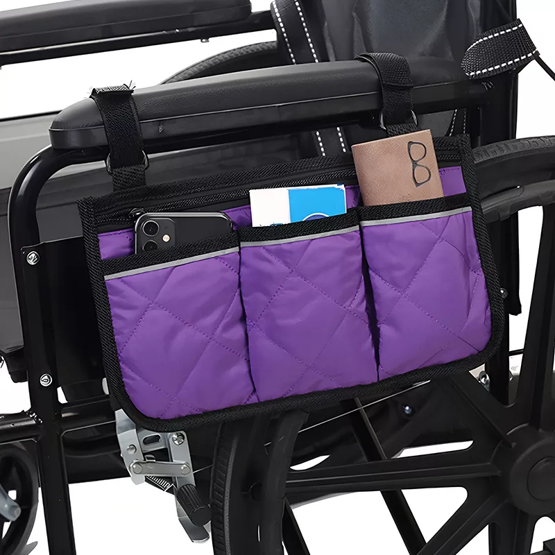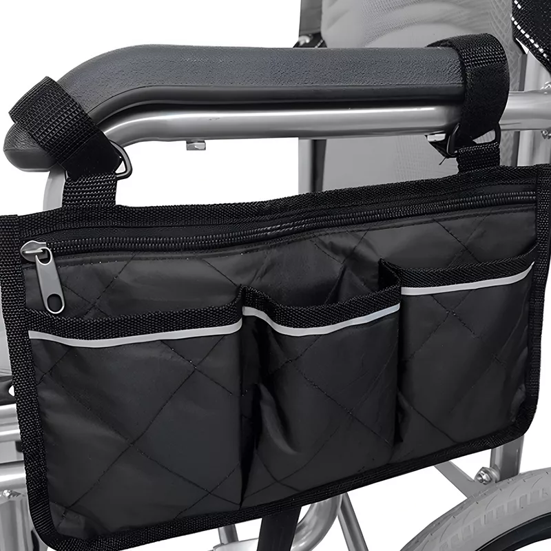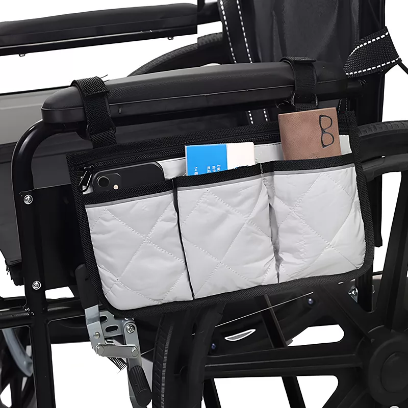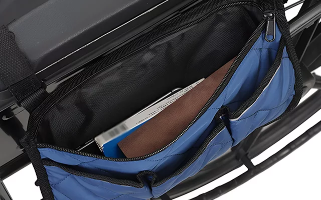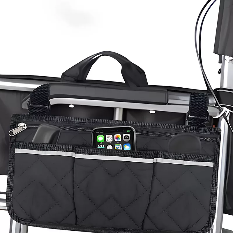 Ortorex rullestolveske festes sikkert og holder seg på plass. Flere lommer hjelper deg å holde orden og finne ting lett. Refleksdetaljer gir bedre synlighet og sikkerhet om natten.