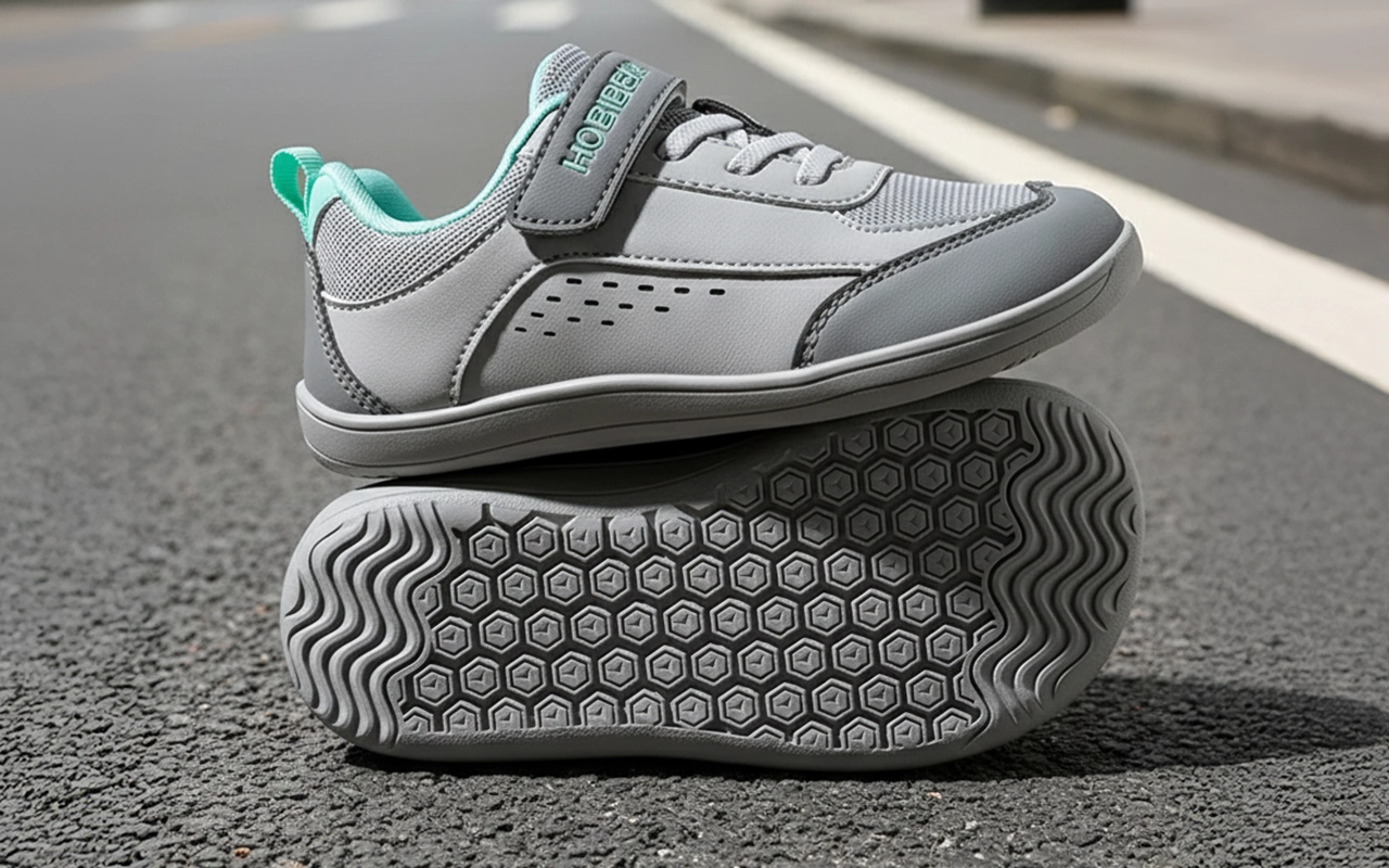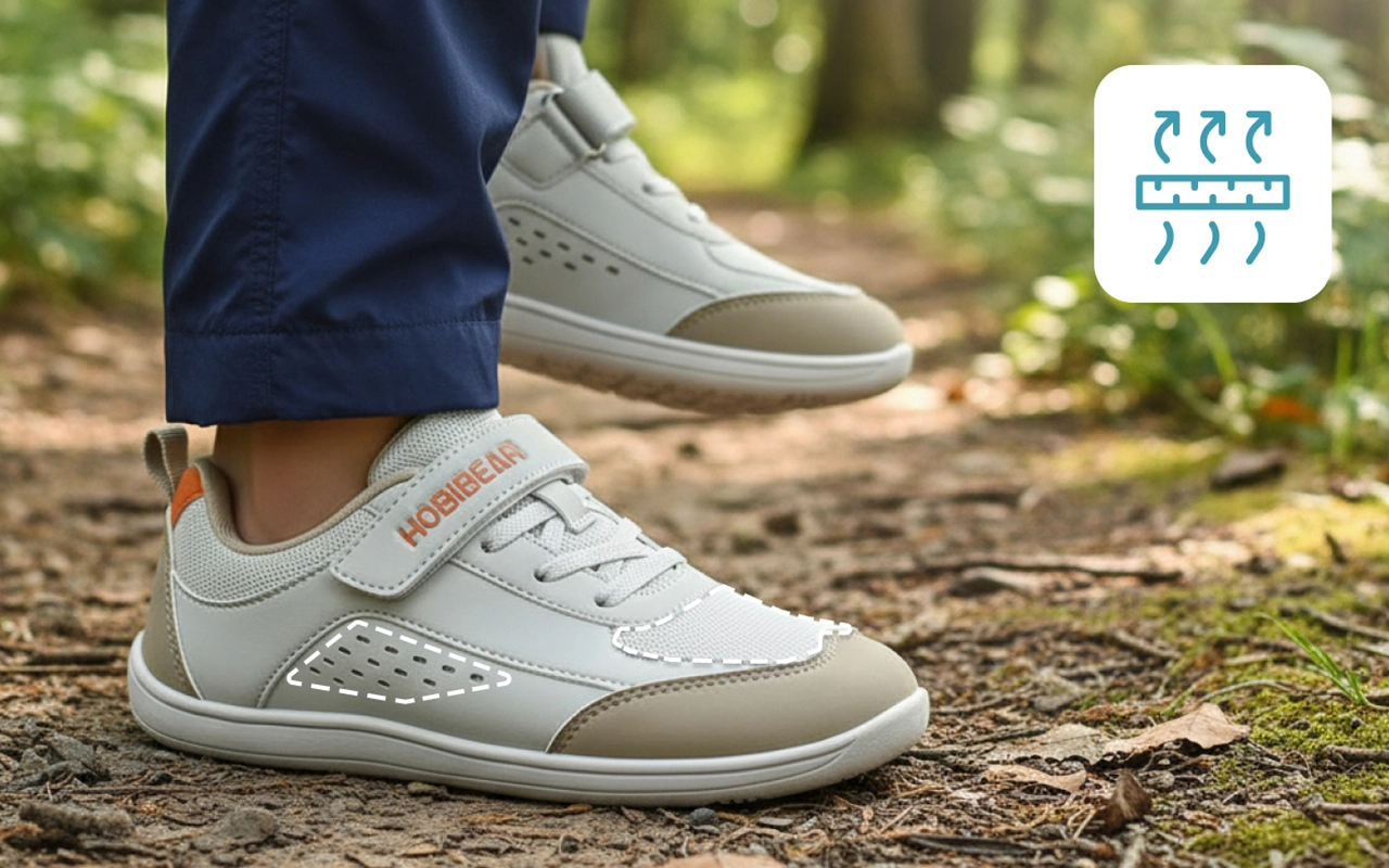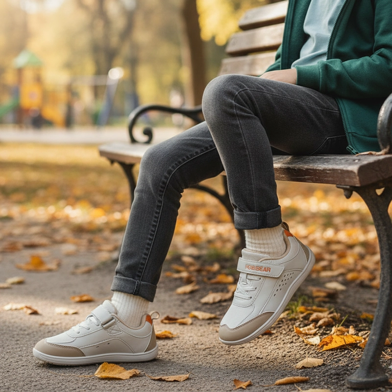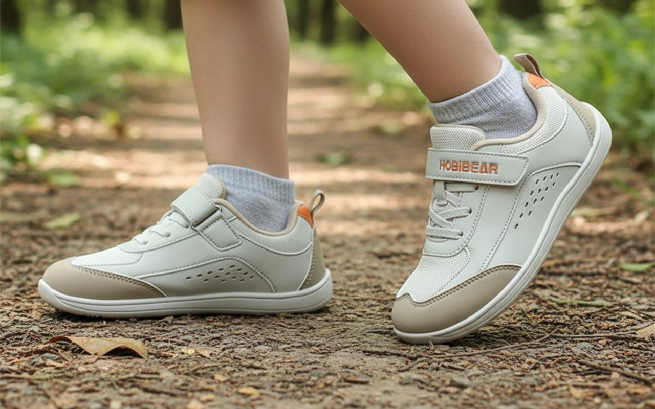 Barnas føtter holder seg avslappet fordi tærne aldri føles trange. Naturlig spredning gir bedre balanse og komfort på alle underlag.