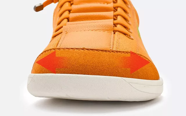 Romslig front holder trykket unna sensitive ledd. Hver tur føles behagelig fordi tærne kan spre seg lett.