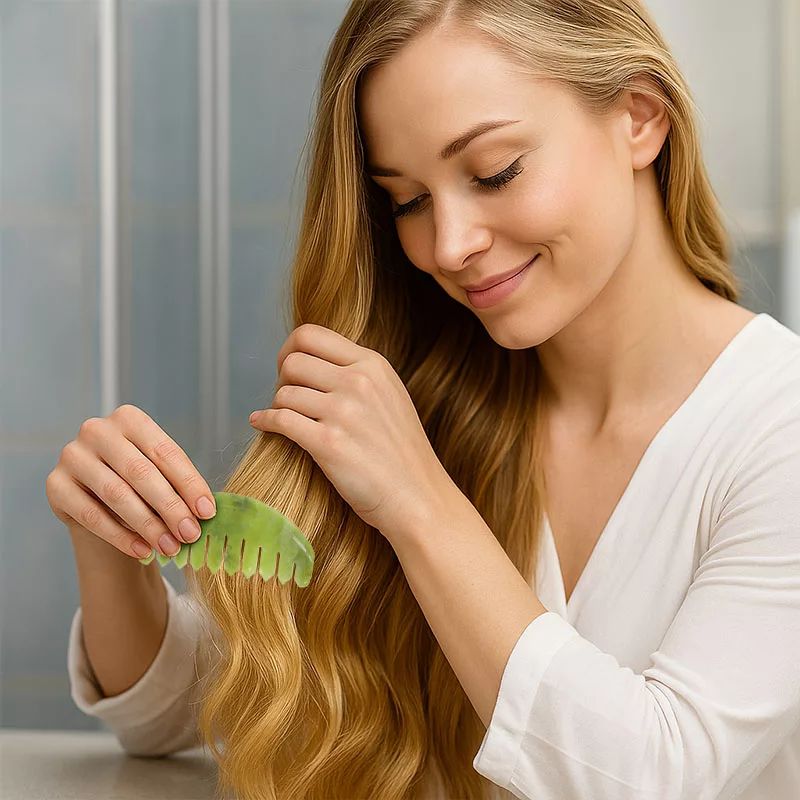 Jeg elsker hvordan den løser opp floker i vått hår uten å gjøre vondt. Jaden føles alltid kjølig og beroligende mot hodebunnen, noe som er så avslappende.
