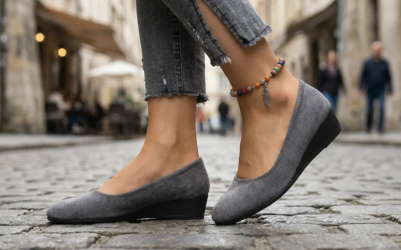 Søte kilehæler, komfortable for lange turer og daglig bruk.