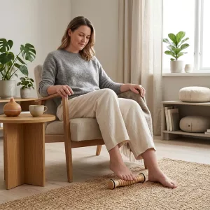Jeg har denne tredrullen under pulten og bruker den under jobbmøter. Den roer ned hælsmerten og gjør at føttene føles varme og avslappede.