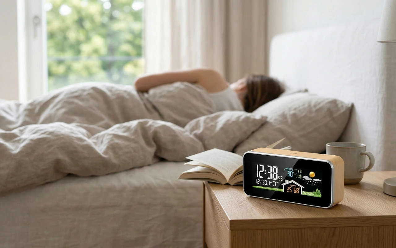 Kjøpte denne treklokken til soverommet vårt og elsker den. De lyse tallene er lette å se, og fuktighetsmålingen hjelper med den tørre huden vår.