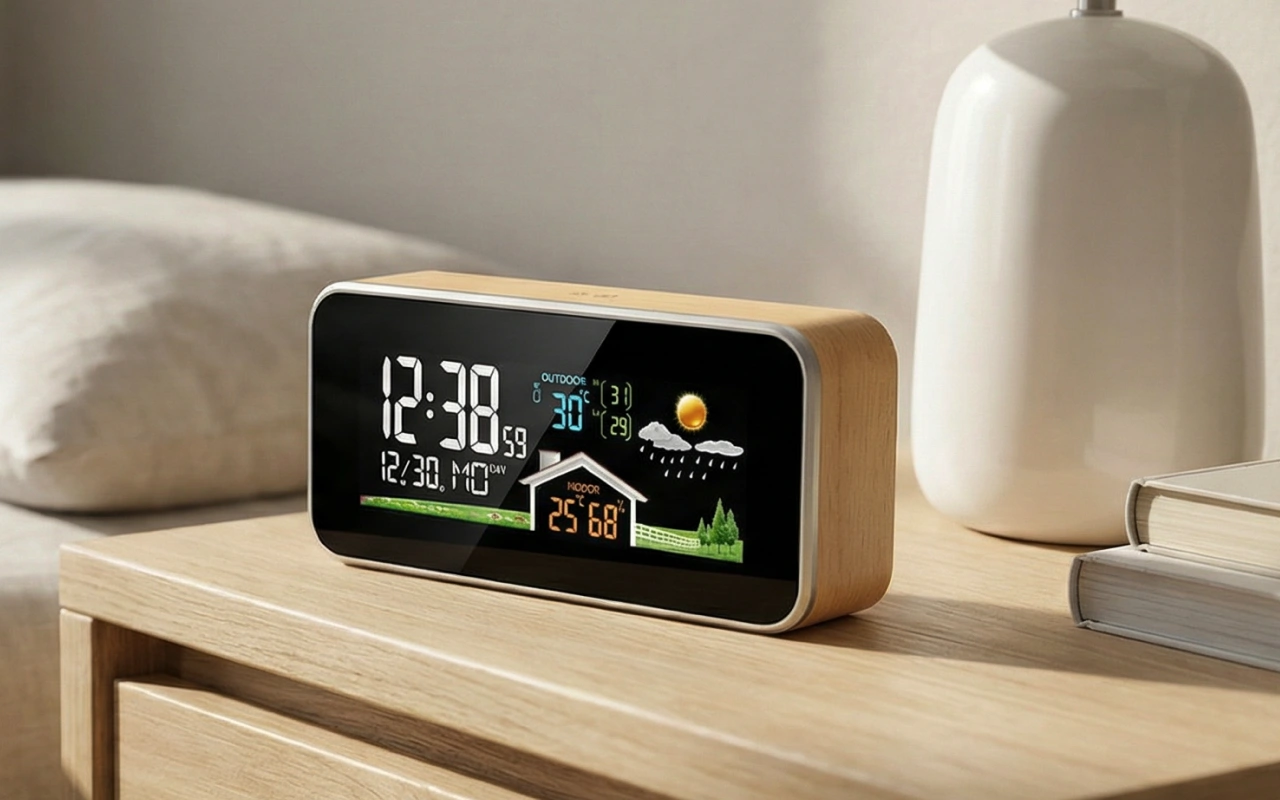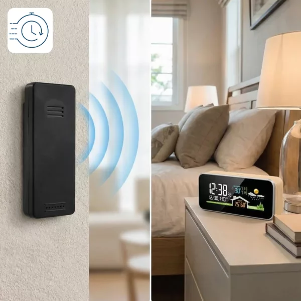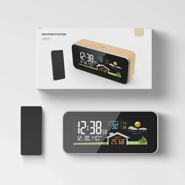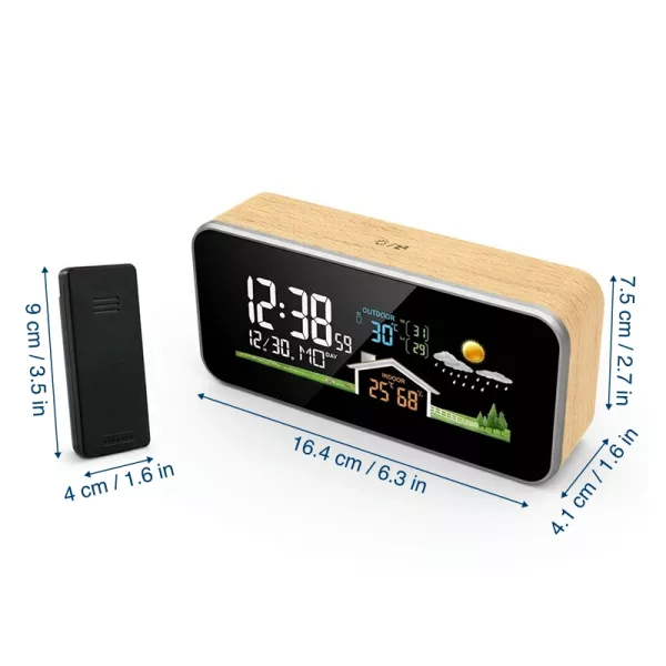 Føl trygghet ved å vite nøyaktige forhold i rommet ditt. Ortorex værstasjon gjør det enkelt å se temperatur og luftfuktighet med et blikk. Den lyse skjermen hjelper deg å lese klokkeslett eller værvarsel uten å måtte reise deg. Den elegante trestilen passer vakkert inn i alle moderne oppholdsrom.