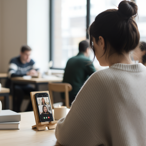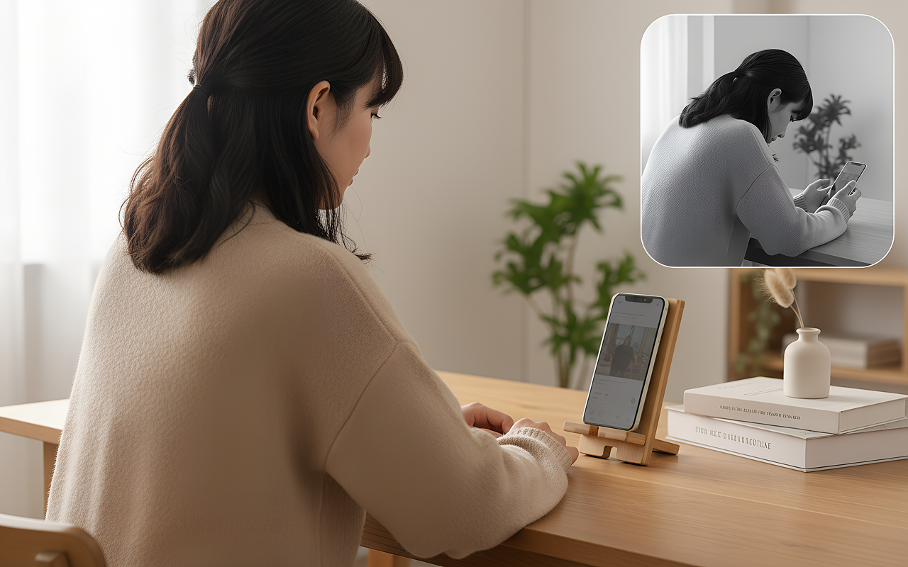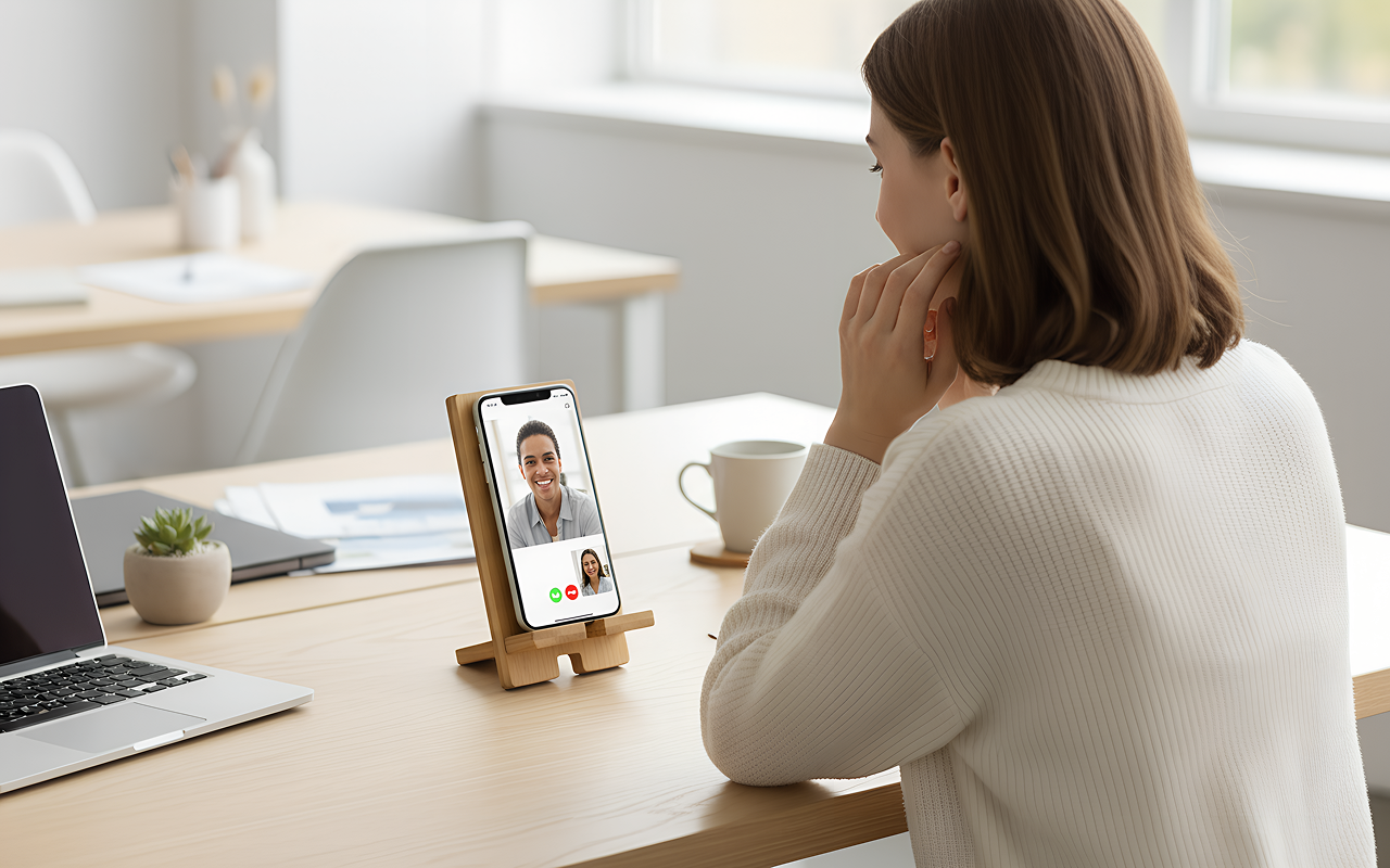 Denne holderen i tre holder mobilen min stødig for nettkurs. Jeg har hendene fri til å ta notater, og nakken gjør ikke vondt lenger!